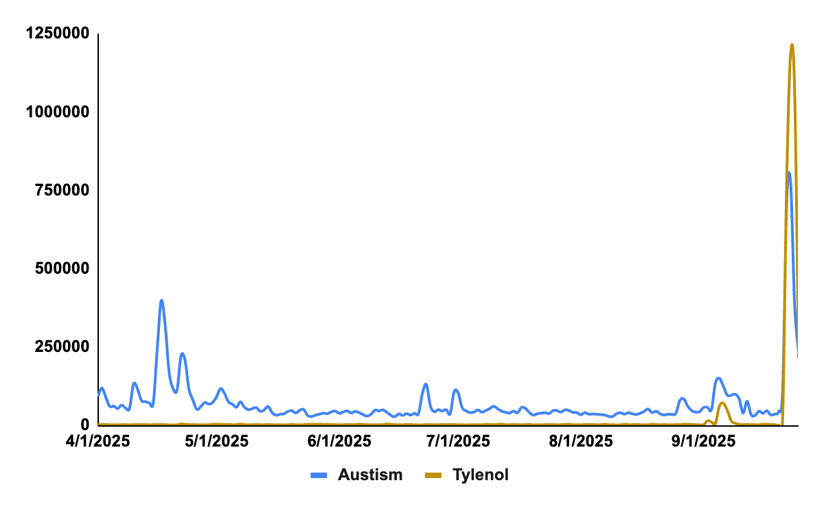 The press conference caused a massive spike in online conversations about Tylenol, fueling a nearly 18,000 percent increase in posts containing the words “tylenol” or “acetaminophen” compared to the previous week. There were 3.2 million mentions of Tylenol and 2.1 million mentions of autism between September 22–25, compared to 44,000 and 361,000 mentions, respectively, between September 15–21.