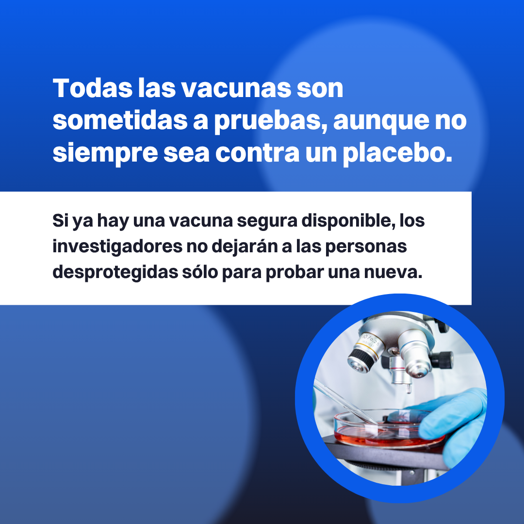 EE.UU. tiene muchos sistemas establecidos para garantizar la seguridad de las vacunas. Todas las vacunas son sometidas a pruebas de seguridad rigurosas y prolongadas por una buena razón: Usar controles con placebo para probar una vacuna nueva cuando ya existe una vacuna eficaz arriesga innecesariamente a las personas.